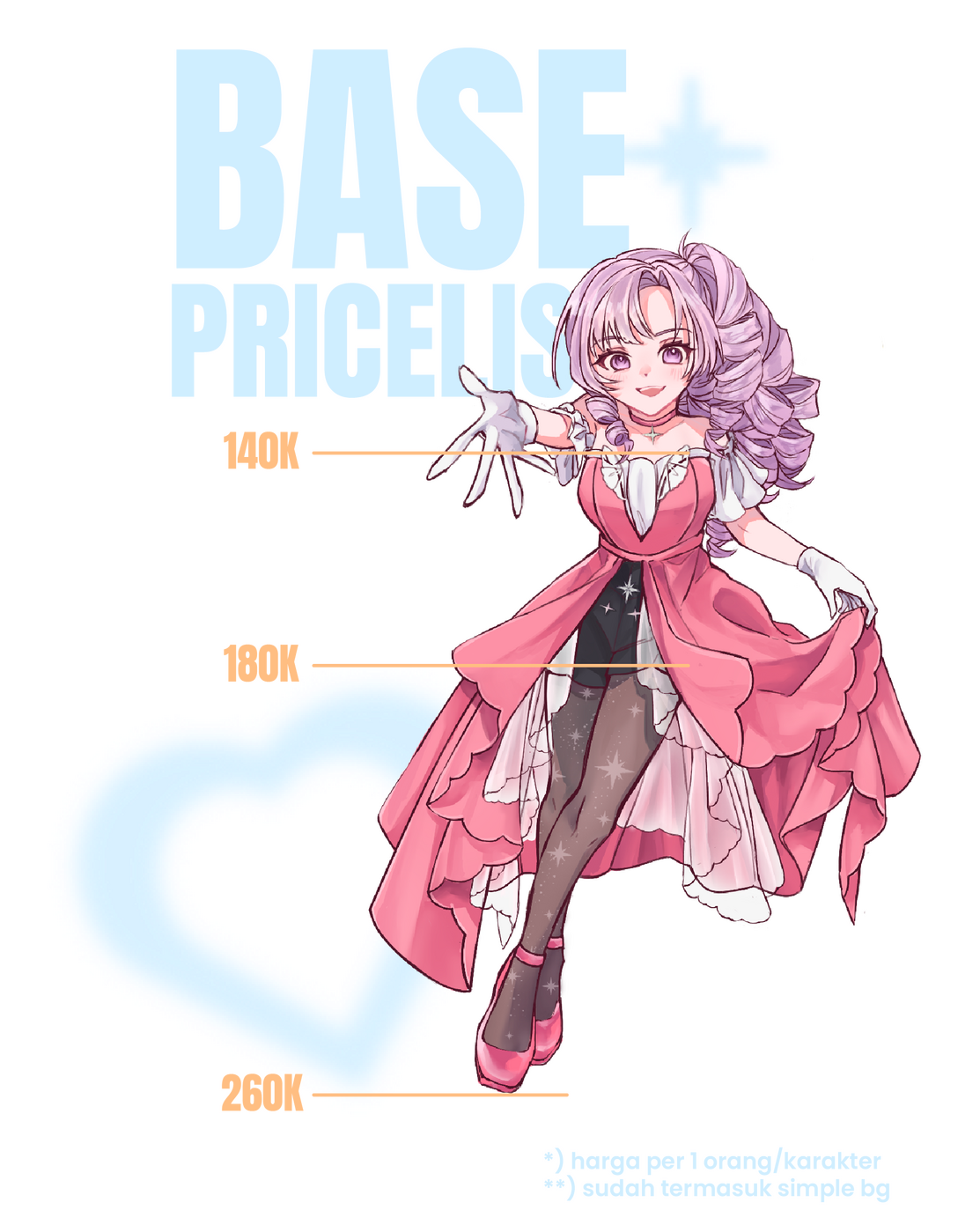 | Omakase/skeb (chara only) OK! | 90% base price | minimal tolong sediakan base design ya! No revision & discussion! |